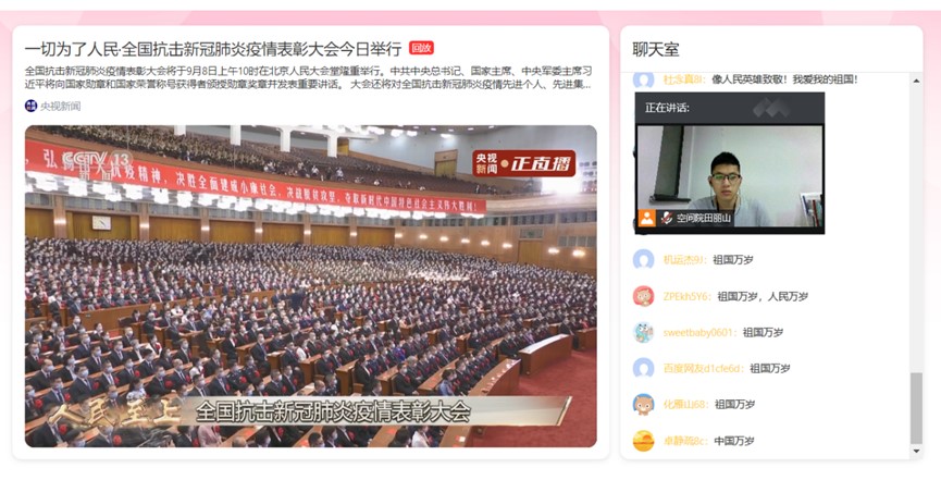 9月8日早上10点全国抗击新冠肺炎疫情表彰大会在北京人民大会堂隆重举行。中共中央总书记、国家主席、中央军委主席习近平向国家勋章和国家荣誉称号获得者颁授勋章奖章并发表重要讲话。空间科学与技术学院组织研究生党支部就此学习习近平讲话精神并进行线上讨论。