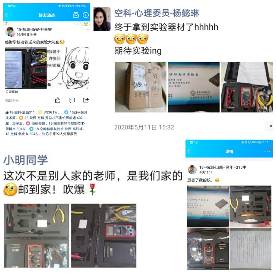 (通讯员 席慧)“厉害了,我的院!”“这次不是别人家的老师,是我们家的老师。”“邮到家,吹爆!”“终于拿到器材了,期待实验ing”……5月10日,空间科学与技术学院2017级、2018级学生们的朋友圈洋溢着满满的自豪、兴奋和感动。一份份满载着老师们谆谆关怀和同学殷切期待的“个人移动实验室”,跨越过千山万水,背负着特殊使命,在“停课不停教、停课不停学”的特殊时期抵达了学生们手中。截止5月底,空间学院学生已经使用“个人移动实验室”在圆满完成了3次远程实验课,线上、线下相结合的教学模式助力各项实践训练稳步推进。