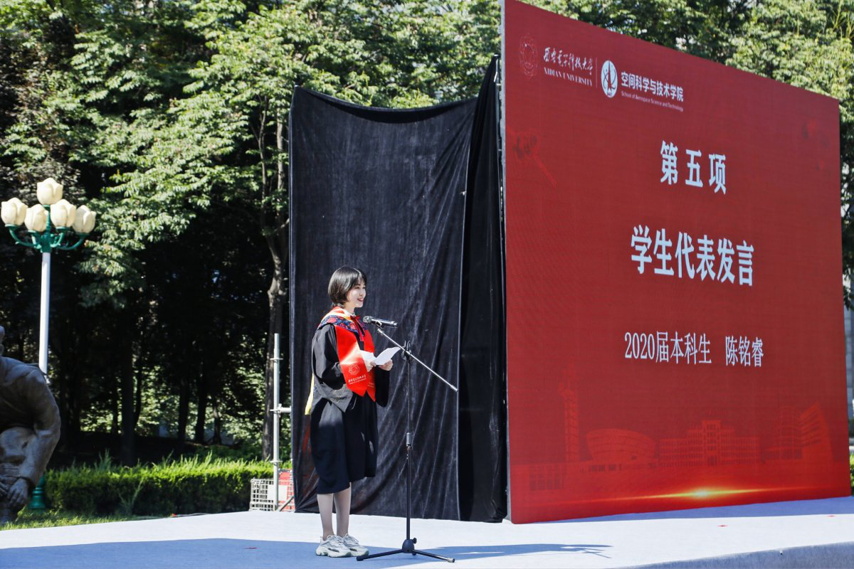 “请允许我代表空间院全体毕业生,向疫情期间所有奋战在第一线的逆行者致以最崇高的敬意,也向精心栽培我们的领导老师和悉心关怀我们的父母亲人,致以最衷心的感谢!”本科毕业生代表陈铭睿以“我和西电的四年之约”为题,谈及空间院历史性时刻和在校园各个角落的点点滴滴,并激励全体同学:“不忘‘西电红’的底色和‘三有西电人’的使命担当,认准心之所向、身之所往,与航天精神相伴,与共和国同行。”