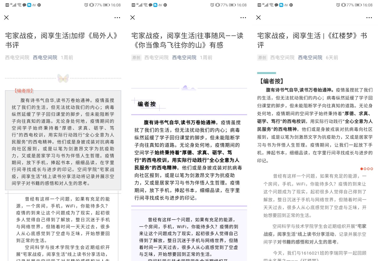 1616021班李瑞同学重温了经典书籍《红楼梦》和《华氏451度》,并发表了个人体会,“虽然《华氏451度》中的场景不会发生在今天,但是我们还是会因为这样那样的原因放下书本,比焚书更可怕的是不去阅读它们,让他们静置在书架上。读完这本书,会让我们有极大的阅读欲望,会使我们再次思考读书的意义,体会读书的幸福。在疫情防控期间,虽然被困在家里,但是我们可以在阅读中获得各种各样的生活体验。在《傲慢与偏见》中了解英国18世纪末19世纪初各阶级人民的生活和婚姻观念;在《儒林外史》中看到有人被功名利禄腐蚀也有人坚持自我,了解明朝时期各类人士对于‘功名富贵’的不同表现;在《你是人间四月天》中感受细腻柔丽,轻盈优雅的春天;或者看一些人物传记,从他们的人生吸取经验……人生中又有几次这样宝贵的时光呢,希望大家能留出阅读的时间,在阅读中领略人生百态、异国风情。”