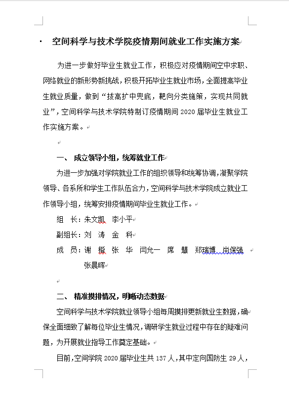 强化顶层设计,统筹就业合力。为进一步加强对学院就业工作的组织领导和统筹协调,凝聚学院领导、各系所和学生工作队伍合力,空间科学与技术学院成立就业工作领导小组,统筹安排疫情期间毕业生就业工作,学院党委书记、执行院长担任就业工作领导小组组长,将各系所负责人纳入就业服务工作队伍,在学院党政联席会议上定期研讨毕业生就业工作。学院领导班子将就业工作作为各项工作的重中之重,党委书记朱文凯、执行院长李小平带头走访西安蜂语信息科技有限公司等校友企业和航天恒星空间技术应用有限公司等相关单位,重点联系西安恒达微波技术开发有限公司等针对性推荐就业岗位,发挥校友力量、拓展就业渠道,群策群力推进学院就业工作成效。