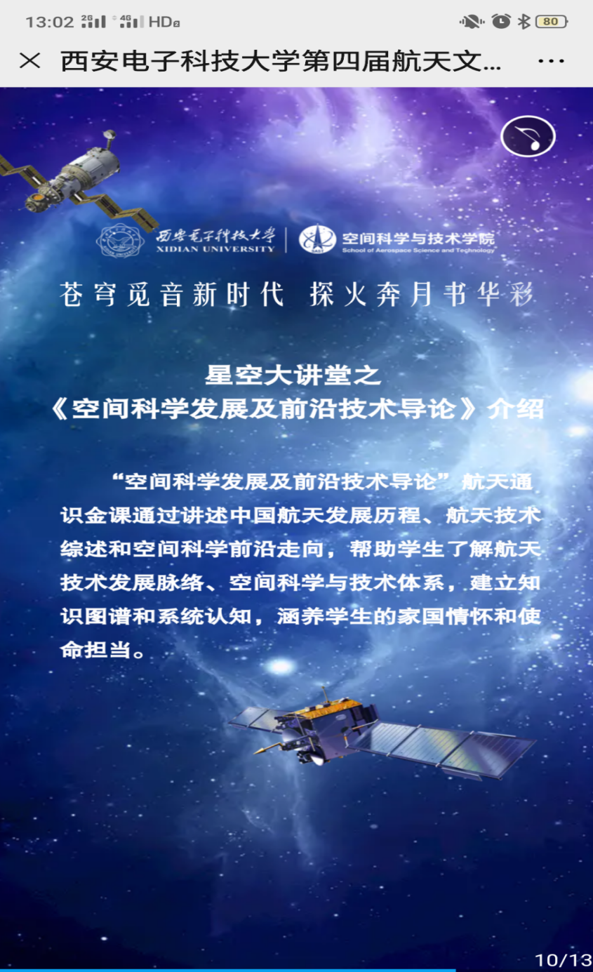 (通讯员 叶宇)2020年4月24日下午,时值西安电子科技大学第四届航天文化节,空间科学与技术学院筹划已久的“空间科学发展及前沿技术导论”航天通识金课开启首讲,中国航天科技集团公司科技委主任、空间科学与技术学院院长包为民院士奉上主题为《共筑航天梦做航天事业接班人》的精彩报告,1.5万名师生校友线上观看,共话航天梦。