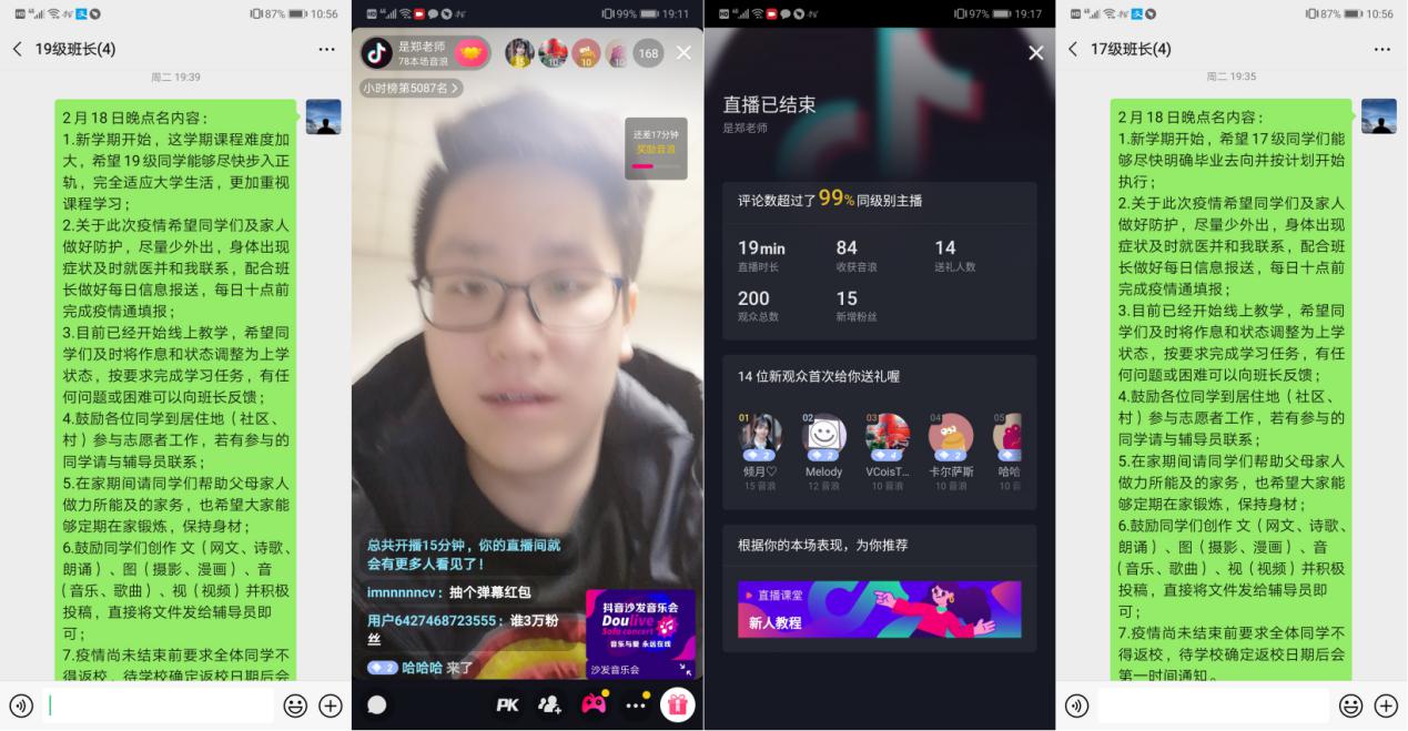 “虽然我们相隔千里,但是学校和学院始终与大家在一起”,“作为这一特殊时期的见证者、亲历者和参与者,我们比以往任何时候都能更加真切地感受到中国发展、中国速度和中国力量”,“非常想念大家,希望我们能够早日在西电校园相聚”,2月18日晚19:00,抖音直播间,空间学院2017级、2019级辅导员郑瑞博面向240余名学生开展了一次特殊的“线上点名”。虽然学生返校的进度推迟了,但对学生的教育管理不能推迟,点名过程中,郑瑞博结合学校规定对近一段时间学生的课程学习、疫情防护、时间作息、课余生活提出了要求和建议,并以此次疫情防控阻击战为实例对学生进行了思想教育。与此同时,郑瑞博还传达了学校和学院对同学们的关怀和问候,“在这一特殊的时间段,同学们在学习上和生活上遇到的任何问题都可以随时提出,学校和学院将会尽最大可能予以支持和解决,希望同学们不忘初心、保持信心、坚守决心,我们即将迎来胜利!”
