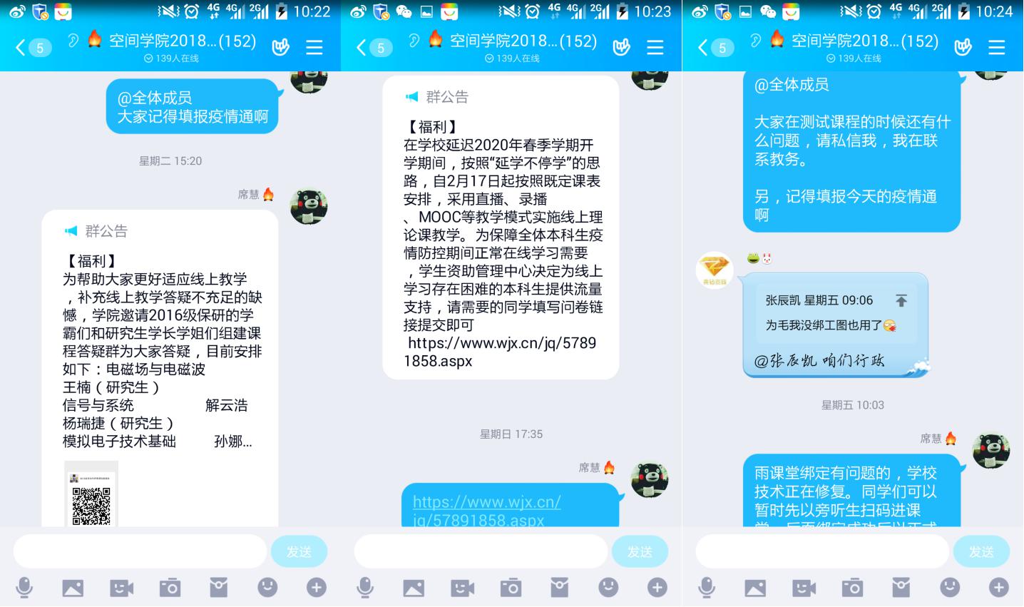 自新冠肺炎疫情出现以来,空间学院学工队伍全体在线、及时行动,第一时间完成了学生情况摸排工作,有针对性的对学生进行网格化管理,对关键学生进行一对一常态化关怀。同时,学工队伍依托微信公众号、抖音等新媒体平台传递正向积极能量、普及疫情防控方法、宣传师生志愿工作、分享科研学习攻略、展示学生原创作品,常态化开展以爱国主义教育和爱与感恩教育为主的线上思政,引导学生牢固树立战胜疫情的信心和决心。