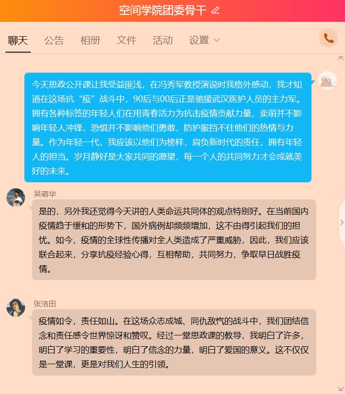 空间学院团委骨干张博康说:“今天思政公开课让我受益匪浅,在冯秀军教授演说时我格外感动,我才知道在这场抗“疫”战斗中,90后与00后正是驰援武汉医护人员的主力军。拥有各种标签的年轻人们在用青春活力为抗击疫情贡献力量,卖萌并不影响年轻人冲锋,恐惧并不影响他们勇敢,防护服挡不住他们的热情与力量。作为年轻一代,我应该以他们为榜样,肩负新时代的责任,拥有年轻人的担当。岁月静好是大家共同的愿望,每一个人的共同努力才会成就美好的未来。”