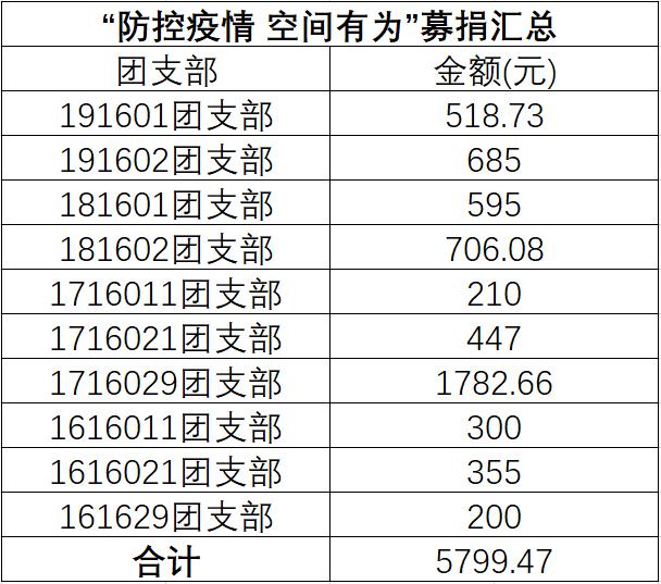 (通讯员 郑瑞博 张博康 林泽辉)自新冠肺炎疫情发生以来,在党中央集中统一领导下,全国人民都在为抗击疫情不懈努力着。了解到一线医护人员缺少防护物资,空间科学与技术学院不少学生表示希望为武汉捐款捐物,为此次疫情阻击战贡献力量。2月9日至11日,在学院团委的组织下,各团支部积极响应,面向学生募集到了5799.47元善款,经由专人以“西安电子科技大学空间学子”的名义通过线上官方渠道捐赠给了武汉市慈善总会,款项被列入新型冠状病毒防控专项基金中。