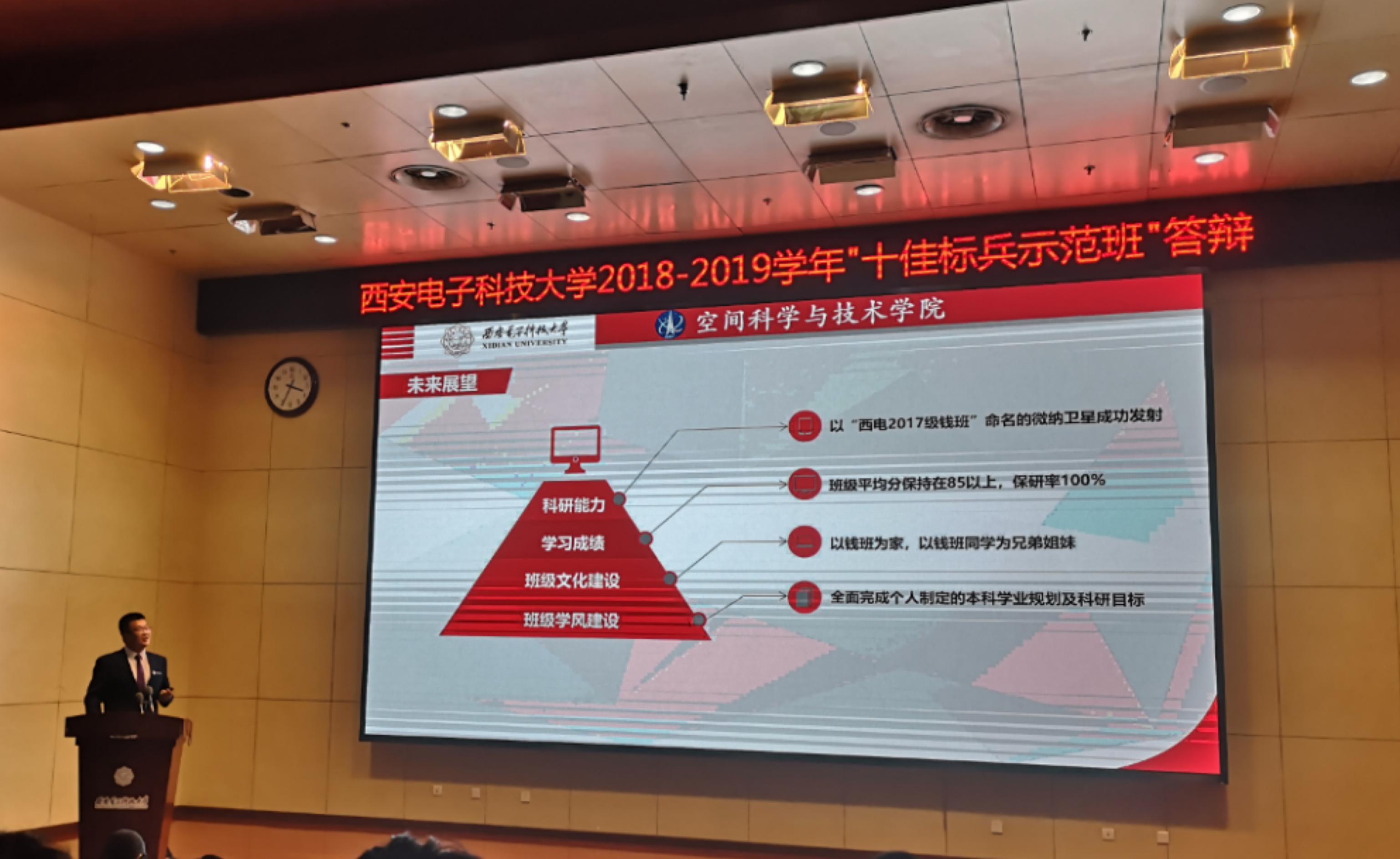 (通讯员 郑瑞博 沈子卓)为培养学生团结奋进精神和集体主义观念,加强班级在学生教育管理中的作用,营造“比学赶帮超”的氛围,选树先进班级典型。2019年11月1日下午,西安电子科技大学2018-2019学年“十佳标兵示范班”答辩在南校区行政楼210报告厅举行。来自各学院、书院的18个候选班级经过层层筛选进入最终答辩环节。空间科学与技术学院2017级钱学森空间科学实验班在答辩场上展现出了钱班学子浓厚深切的家国情怀,严谨认真的学习态度,团结友爱的班级氛围,追求卓越的创新能力,最终获得“十佳标兵示范班”称号。