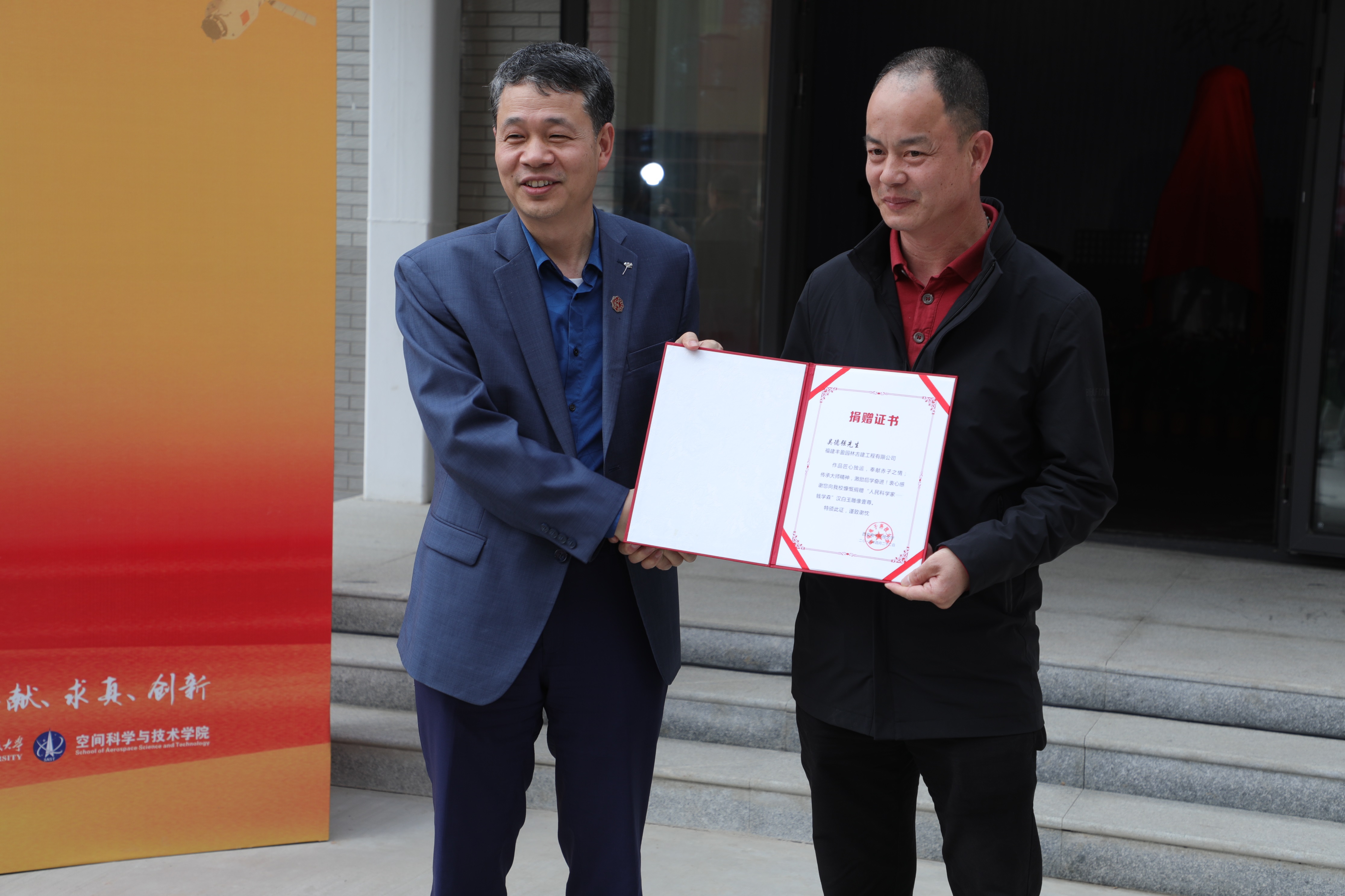 随后,“人民科学家——钱学森”雕像揭幕典礼在南校区极端环境下装备效能实验室隆重举行。副校长石光明代表西安电子科技大学接受捐赠并向中国石雕艺术大师吴德强颁发雕像捐赠证书,包为民院士、郑晓静院士、张贵田院士、石光明教授、陈大亚先生、原钱学森秘书顾吉环等中国航天科技集团、中央军委科技委和西安电子科技大学嘉宾共同为雕像揭幕。