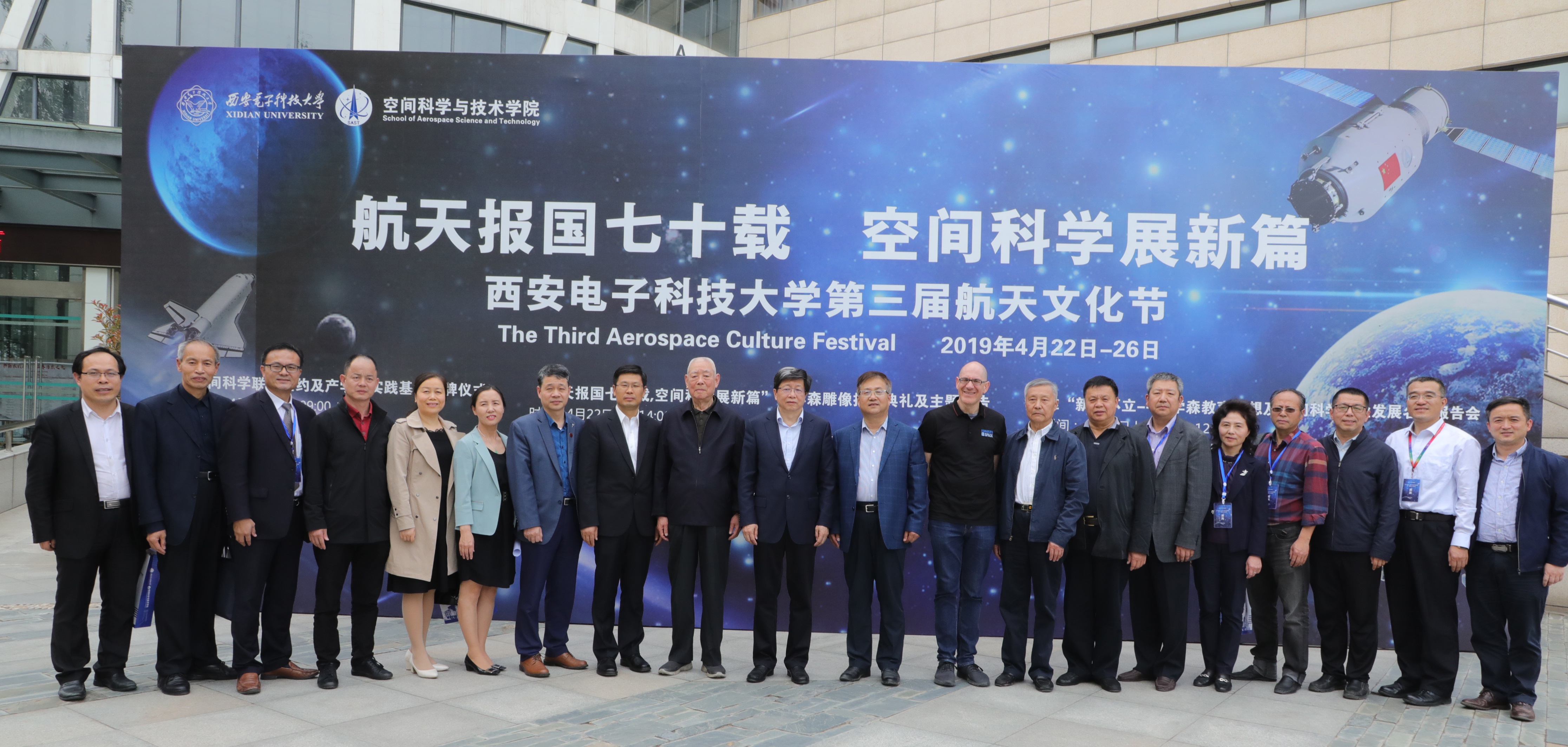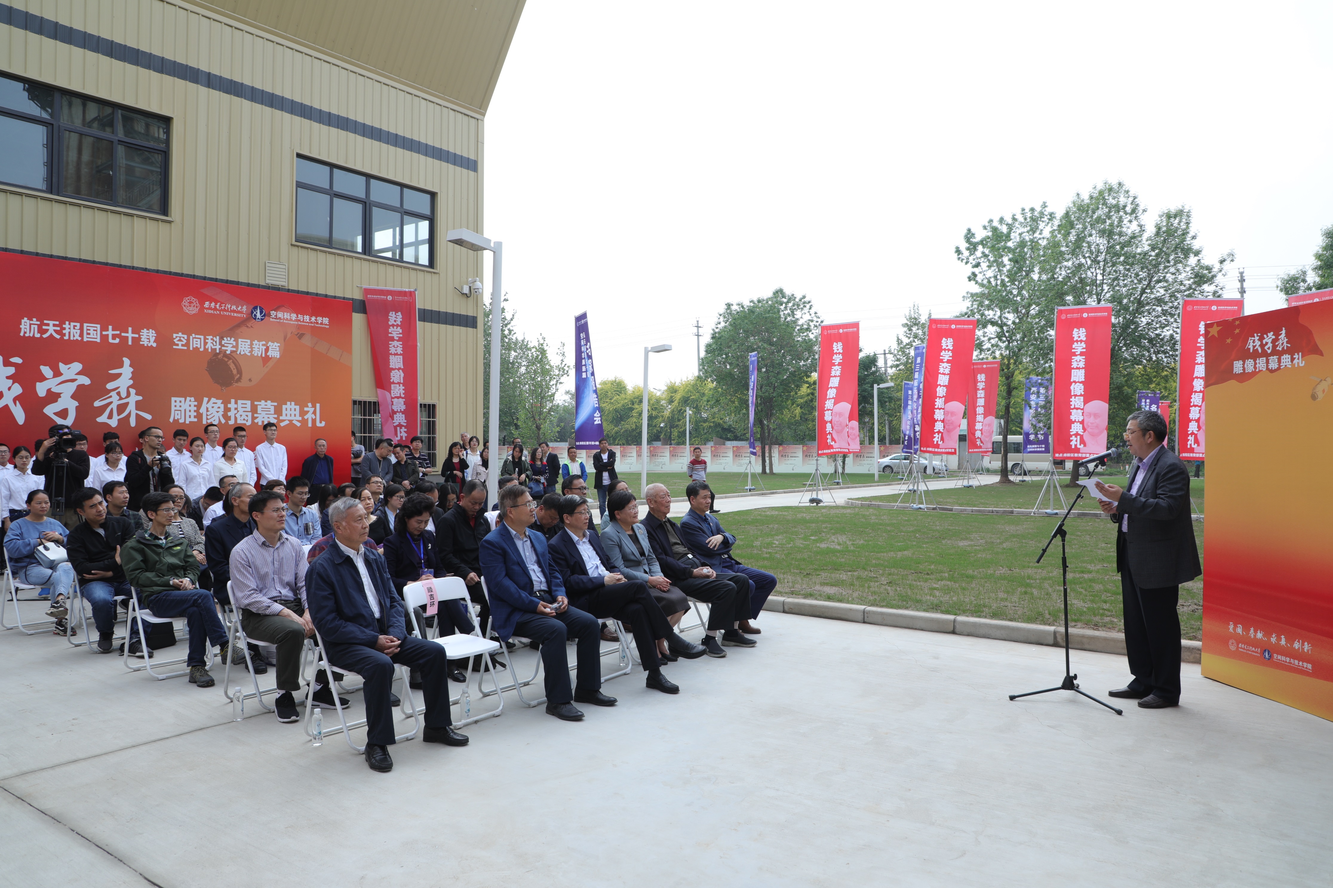 为传承航天文化、弘扬钱学森精神,落实创新教育思想大讨论之学校倡议,探索新时代航天发展及空间科学创新拔尖人才培养途径,2019年4月21日-30日,西安电子科技大学特举办以“航天报国七十载, 空间科学展新篇”为主题的第三届航天文化节。22日下午,第三届航天文化节开幕式暨“人民科学家——钱学森”雕像揭幕典礼在南校区隆重举行。