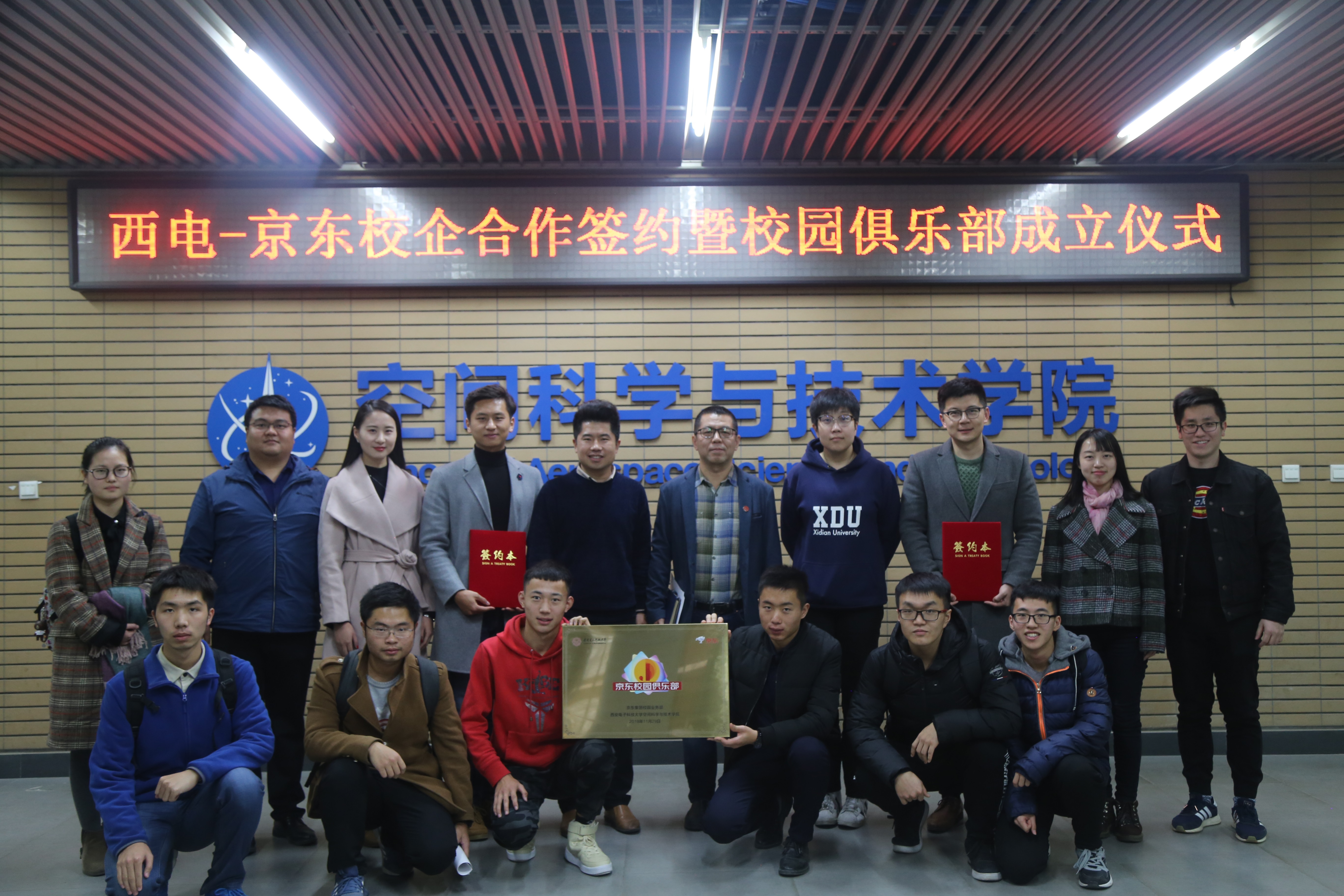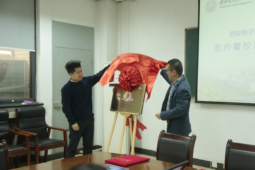 刘涛和郑炎分别代表双方签署了校企合作协议。朱文凯和樊琪共同为西安电子科技大学京东校园俱乐部揭牌,宣布俱乐部正式成立。