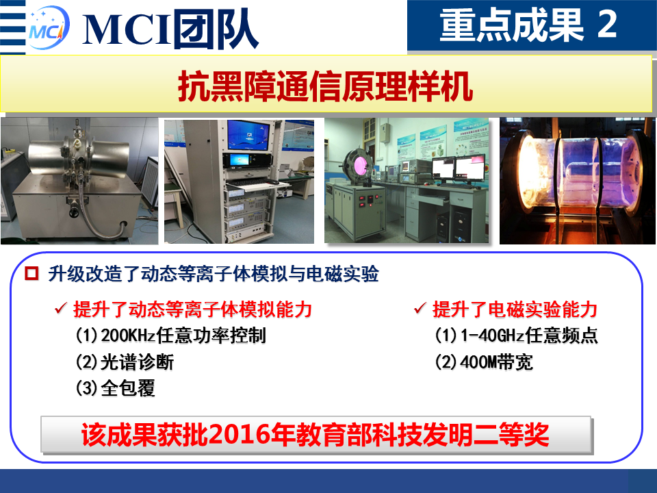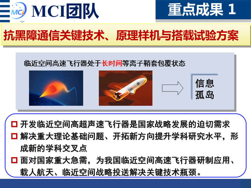 MCI团队牵头"临近空间高速飞行器等离子鞘套信息传输理论"项目,团队在该项目研究中发明了长时间连续可控的等离子体模拟装置,建立了等离子体电磁波传播特性和通信信号传输特性实验环境,以及提出了等离子鞘套环境下能够提高天线辐射性能的天线自适应补偿方法。