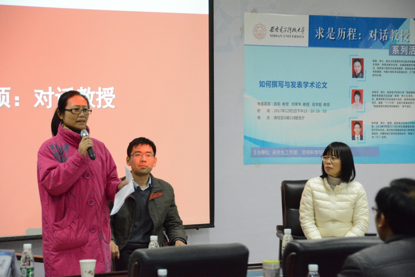 “求是历程:对话教授”座谈会上,以学术沙龙形式为师生提供互动平台。西北大学陈莉教授、西安电子科技大学电子工程学院尚荣华教授和机电工程学院的段学超教授于空间师生共聚一堂,畅谈“如何撰写与发表学术论文”。三位教授以自身经验向学生传道解惑,与会学生积极提问,师生互动交流,气氛活跃而热烈。
