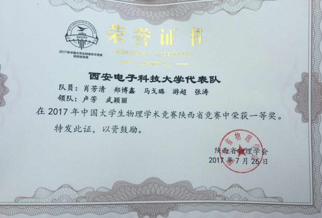“很荣幸能够代表学校参加这次陕西省物理学术竞赛,更荣幸在比赛中荣获省一等奖。”参加此次物理学术竞赛的同学们开心地说,他们在本次物理学术竞赛中荣获佳绩。西电今年第一次参加省赛,他们在较少的准备时间内,从六月左右报名准备这次比赛,再从校赛中经过选拔进入省赛,总的来说还是取得了与努力成正比的结果。获奖的同学们总结道:“在赛前因为我们知道比较晚,所以准备不是很充分,加之考试时期也没有认真准备,7月18号开始才认真准备,也很感谢吴兴林、武颖丽等老师的指导。准备过程中也很感谢另外西电另外一个队伍给我们的帮助(他们最后获得省二等奖)。”