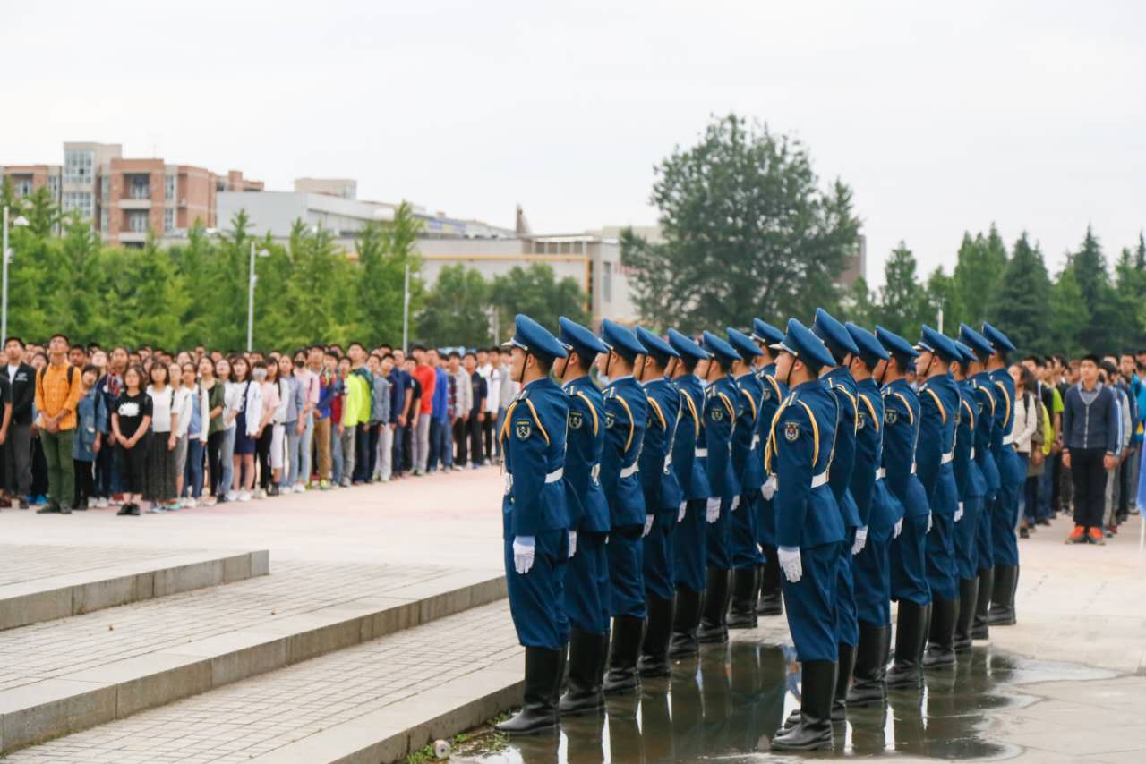 升旗伊始,在2016级本科生赵晋阳同学的主持下,分列式进行曲响起,国旗仪仗队配合着庄严的音乐,踏着整齐的步伐,缓缓护送国旗来到国旗杆下。随后,标兵站定,师生就位,国歌奏起,鲜艳的五星红旗在全体的注目礼下缓缓升起。