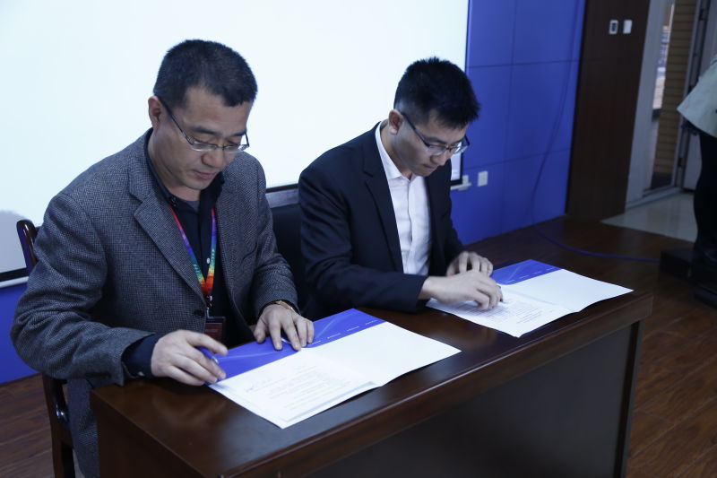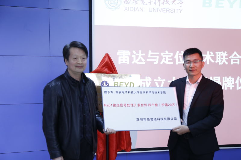 教师代表张华老师在讲话中全面介绍了我院在学生科研创新能力培养中的工作开展情况和取得的丰硕成果。随后,由刘彦明副院长与陈永茂总经理共同签署了“雷达与定位技术联合实验室”合作协议。由党委书记梁玮与陈永茂总经理共同为联合实验室揭牌。由陈永茂总经理代表佰誉达向学院捐赠Rsp1雷达信号处理开发套件四十套(价值20万)。
