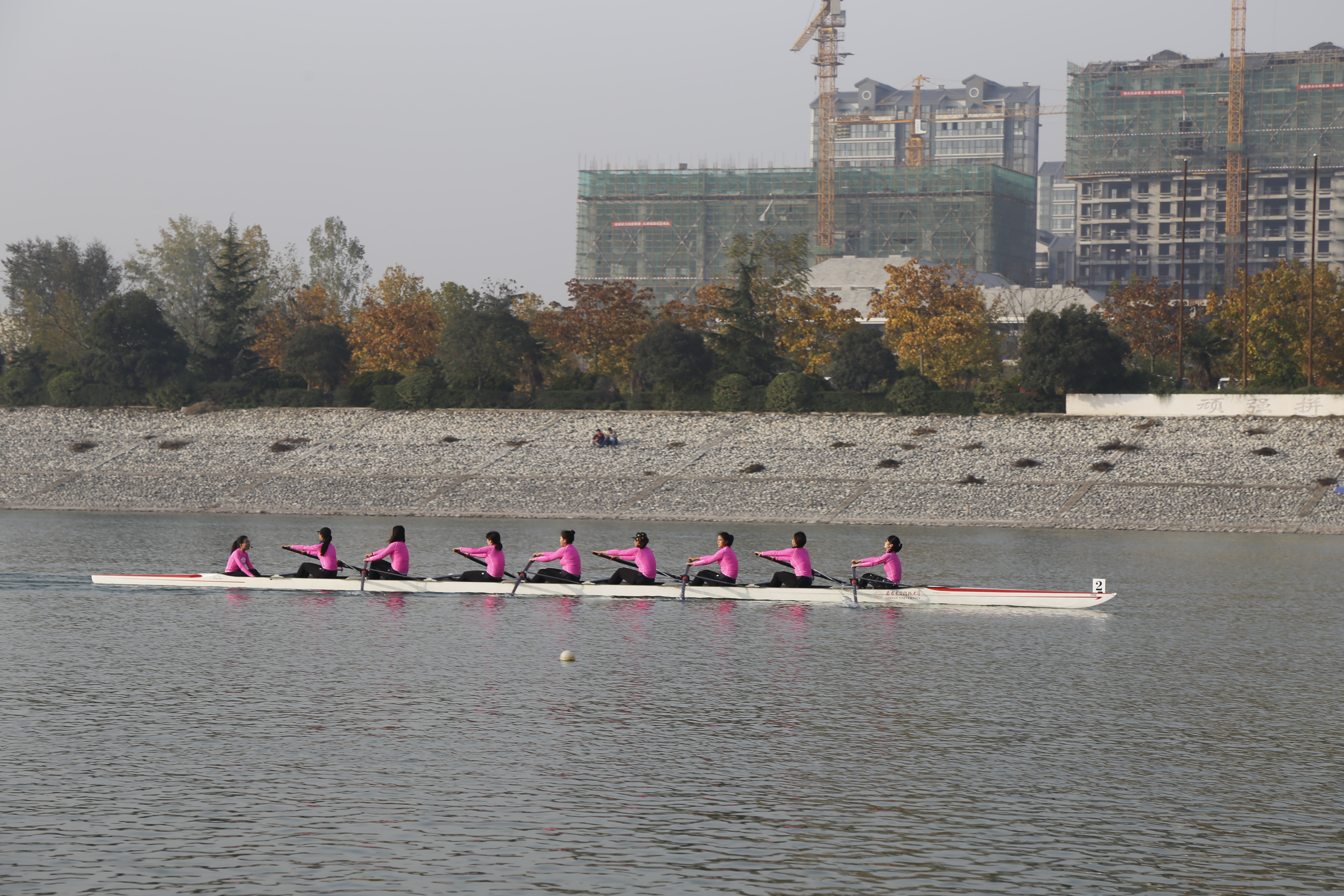 比赛分为预赛和决赛,首先进行的是男子组的预赛,空间院的赛艇队处在第二组,随着一声令下,几只赛艇如箭般急射而出,在前半程几支队伍没有拉开太大差距。在后半程,空院优良的训练成果显现出来,渐渐拉开了与其他队伍的距离。最终空院男子赛艇队以小组第一的成绩进入决赛。与此同时,女子组的表现也十分精彩。空院女子赛艇队从出发开始就遥遥领先,鲜艳的粉红色队服十分显眼,率先撞线,同样以小组第一进入决赛。