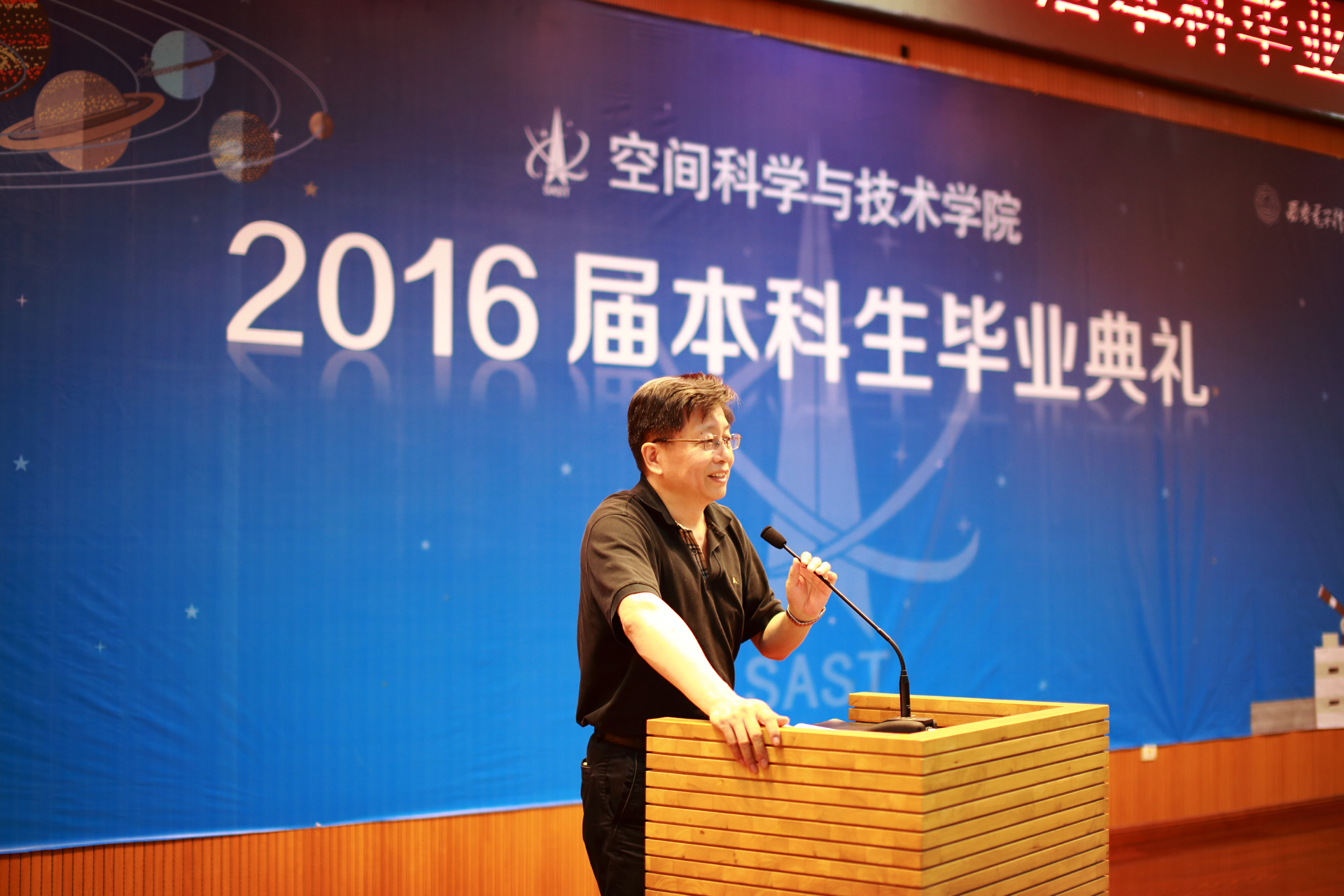 典礼上,包为民院长发表了热情洋溢的讲话,他首先代表学院向第一届优秀的毕业生们表示最热烈的祝贺,对为此辛勤耕耘,奉献在教学一线的老师们表示最诚挚的感谢。他说:“能够与学院全体师生共同见证这一历史时刻,我十分高兴,倍感幸运,空间学院在过去的几年中取得了优异的成绩,但是,最大的成绩就是我们优秀的毕业生们。我们的首届毕业生非常优秀,即将去往国内外各大名校积极深造,不论你们将来去往何处,都是为我们国家的建设积蓄力量。”包为民还与师生们分享了长征7号运载火箭圆满发射的成功喜悦和祖国空间科学的最新进展,他从空间碎片的清理实验、摆渡车实验、空间动力实验谈到长征七号运载火箭的载运能力由八吨上升到十三吨等等。
