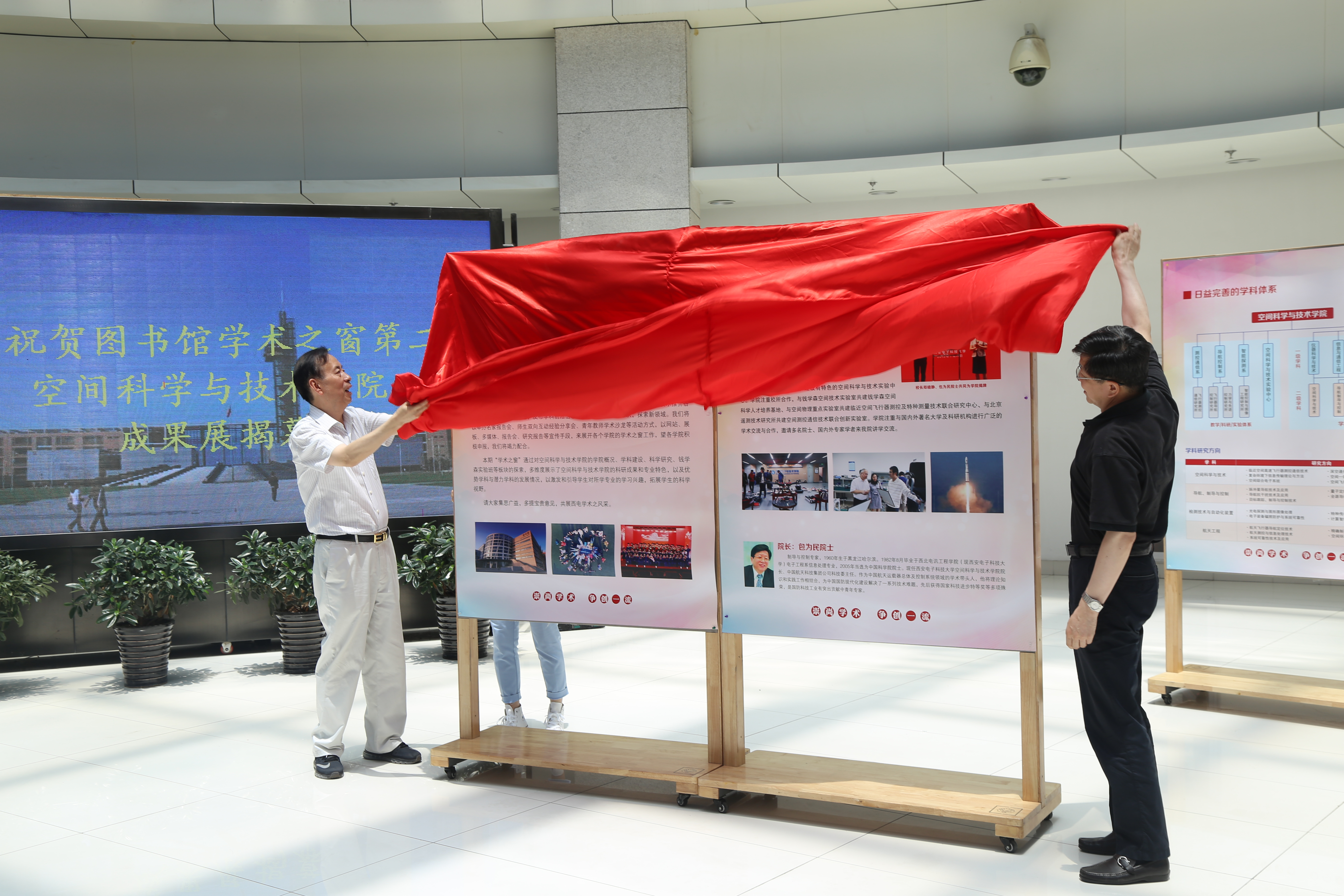 典礼开始前全体师生在图书馆大厅参加了《快速发展中的空间学院》——学术之窗揭幕仪式,郝跃院士与包为民院士共同为学术之窗系列展览揭幕。郝跃在致辞中首先对对学术之窗活动的成功举办表示了衷心的祝贺。他说:“在包为民院长的关怀与带领下,在学院全体师生的共同努力下,空间学院在自成立以来的短短几年内就在科研、教学、人才培养等各方面取得了骄人的成绩。此次学术之窗通过对空间科学与技术学院的学院概况、学科建设、科学研究、钱学森实验班等板块的探索,多维度展示了空间科学与技术学院的科研成果和专业特色,以及优势学科与潜力学科的发展情况,详细地介绍了空间学院在过去的4年中收获的丰硕成果。希望能够通过学术之窗,提高广大学生的专业认识和归属感,拓展学生的科学视野和前沿视角,并能感受和见证空间学院发展过程中的步步峥嵘。”