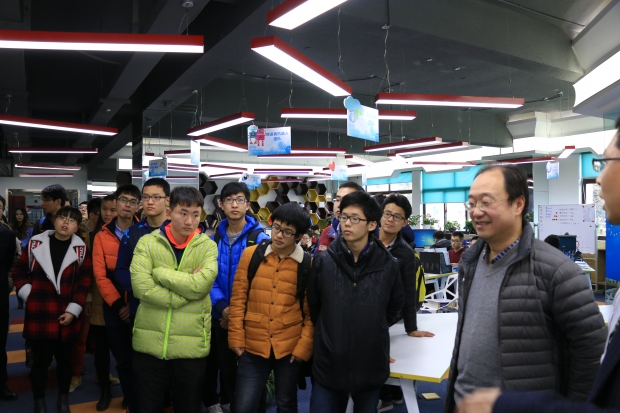 师生们来到在中科创星空间创业团队的办公室,参观了这里舒适温馨的工作环境,办公室里不仅有3D打印机,自动贴片机等基础实验器材,更能感受到充满活力同时节奏紧张的工作氛围。办公室里的一台可以实时通过摄像头监测人心跳的仪器吸引老师同学们驻足观看。