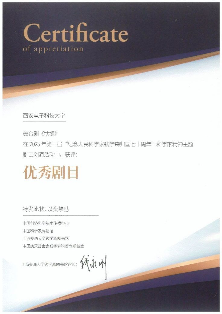 (通讯员 郑瑞博)12月11日下午,由中国科协科学技术传播中心等单位联合举办的“纪念人民科学家钱学森归国七十周年”科学家精神主题剧目创演活动颁奖仪式在上海交通大学举行,西安电子科技大学原创舞台剧《扶摇》在众多优秀作品中脱颖而出,获评“优秀剧目”。