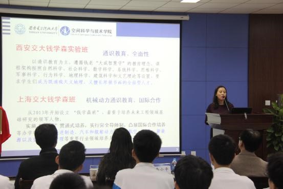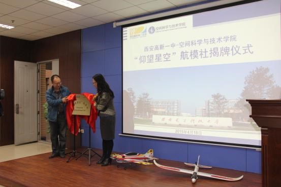 4月18日下午,西安电子科技大学-西安高新一中钱学森班交流开放日暨“仰望星空”航模社揭牌仪式在G-240报告厅隆重举行。高新一中副校长张清彦,西安电子科技大学教务处副处长郭涛,教务处副处长毛立强,校团委副书记朱伟,高新一中近60名高中生及空间院学生代表出席了活动。