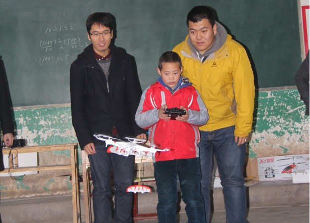 (图为支教学生介绍展示4轴、6轴飞行器,并做飞行表演)