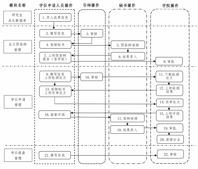 申请学位通过研究生管理系统进行,学位申请人员、导师、学院管理员及答辩秘书登录:西安电子科技大学研究生院主页“研究生管理系统”,操作流程如下: