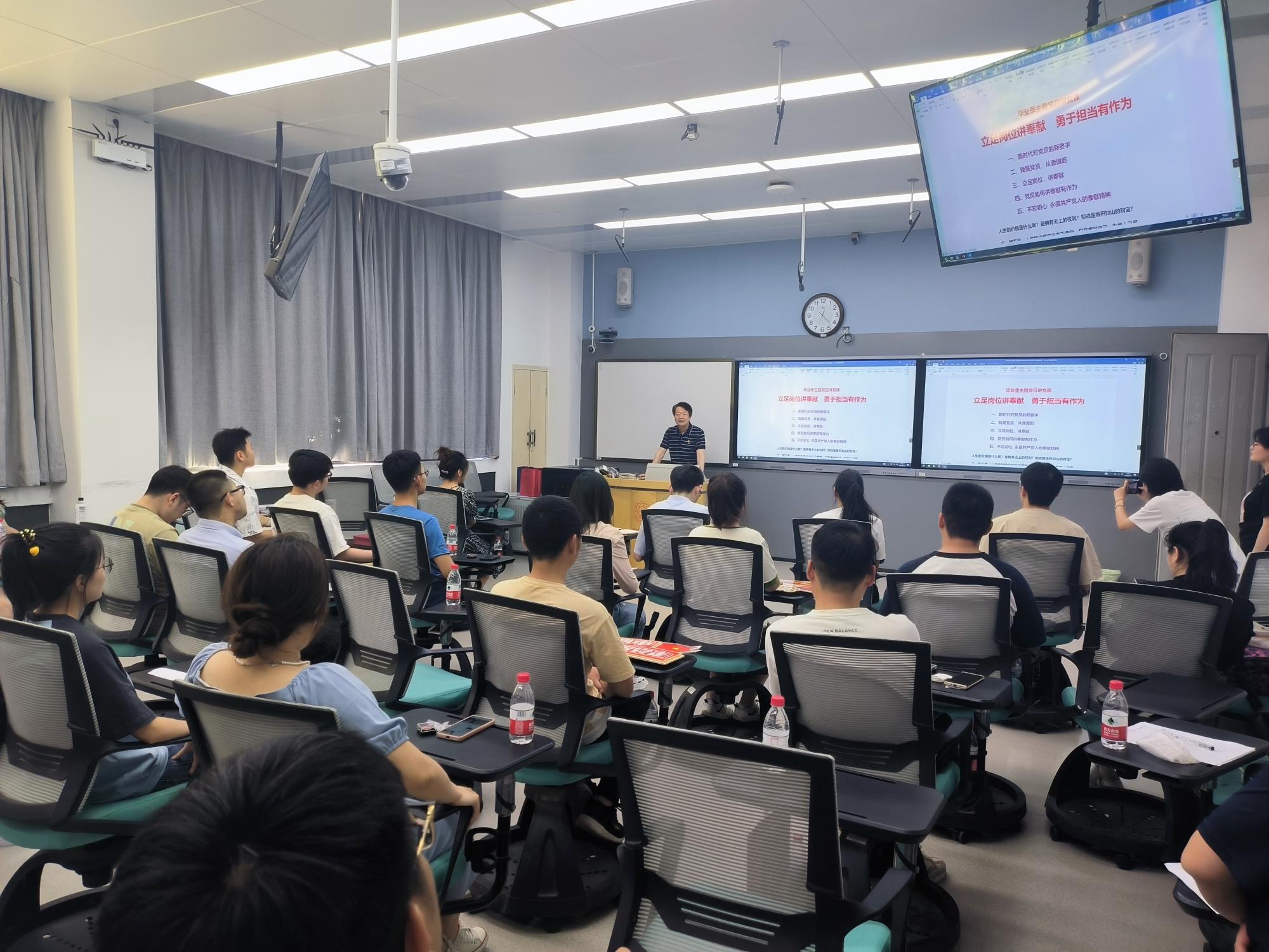 许录平教授以“立足岗位讲奉献,勇于担当有作为”为题,从“新时代对党员的要求”、“我是党员,从我做起”、“立足岗位讲奉献”、“党员如何讲奉献有作为”和“不忘初心,永葆共产党人的奉献精神”五个方面为毕业生党员们带来了一节精彩的党课。他表示,大家今后无论身处哪个工作岗位,心中要始终牢记共产党员的身份和义务,在平凡的工作岗位上创先争优,保持奋发进取的精神状态,发挥先锋模范作用,勇于担当,努力为党和人民事业作出更大的贡献。