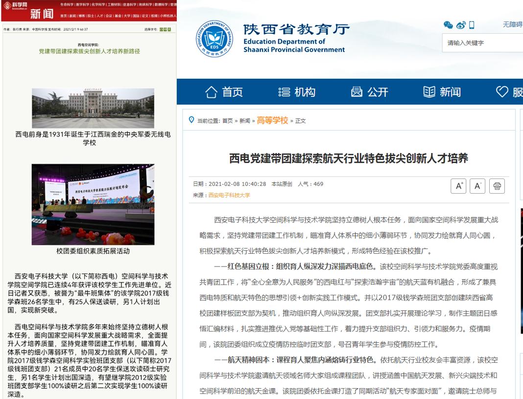 科学网、陕西省教育厅网站专题报道空间学院党建带团建特色人才培养举措